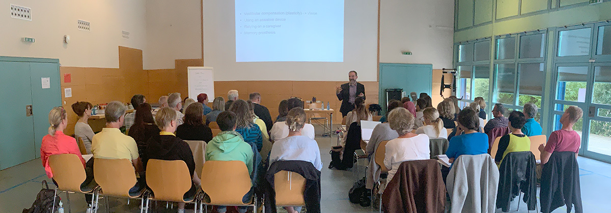 Schwerpunktmäßig wurden Effekte bei neurodegenerativen und geriatrischen Erkrankungen beleuchtet. Studer stellte Methoden wie „Dual Task“ oder „Error-induced Training“ vor, ließ zahlreiche praktische Beispiele in seinen Vortag einfließen und animierte das Publikum unter dem Stichwort „Gamification“ zu spielerischen Tests.
