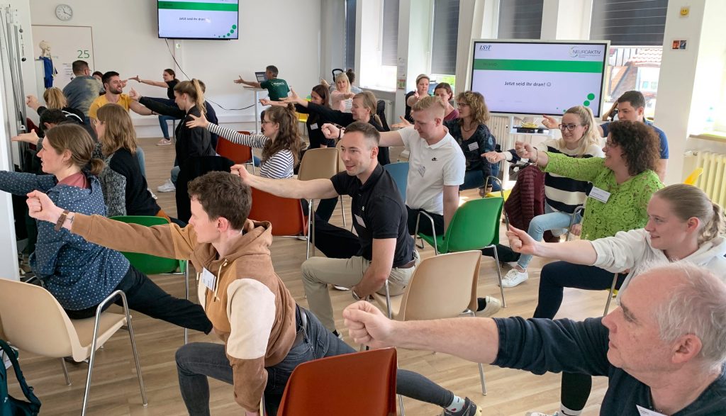 Schwung ins Auditorium brachte Vanessa Meßner mit ihrem Referat zur LSVT-BIG Therapie. Das Intensiv-Behandlungskonzept setzt auf das gezielte Einüben von Bewegungen mit großer Amplitude zur Verbesserung von Bewegungsstörungen bei Morbus Parkinson. Beim Selbsttest eines Übungszirkels wurde auch das Publikum gefordet.